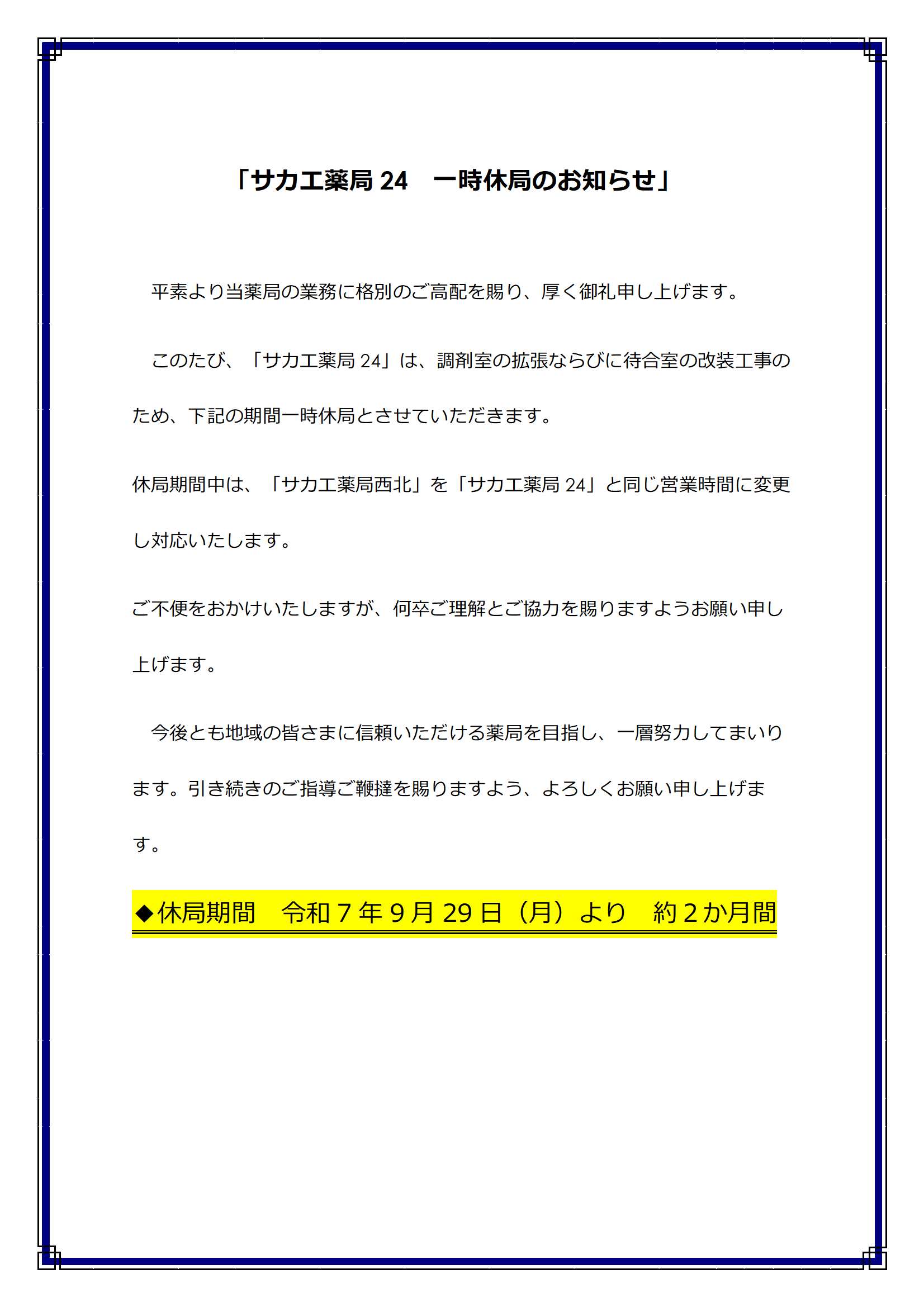 サカエ薬局24 一時休局のお知らせ